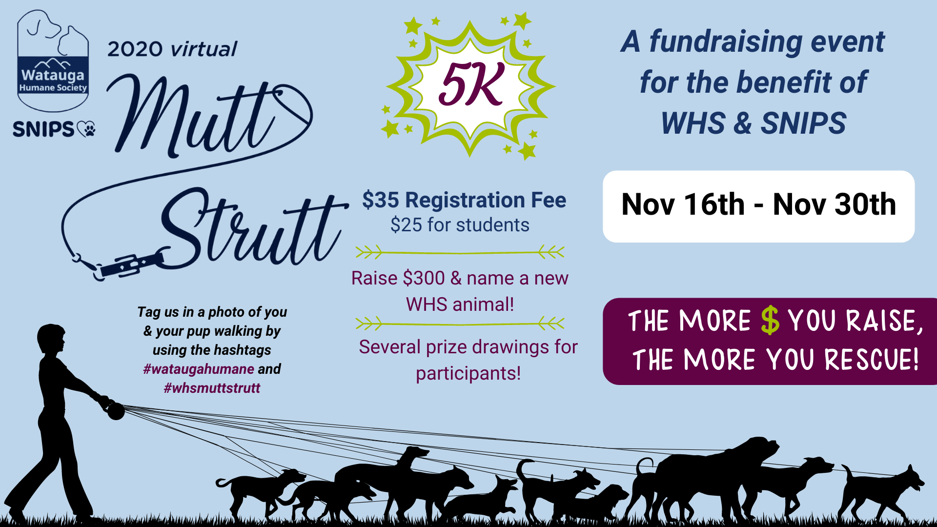 T-shirts will be given to all participants. If you have questions, please reach out to Paula at paulak@wataugahumanesociety.org